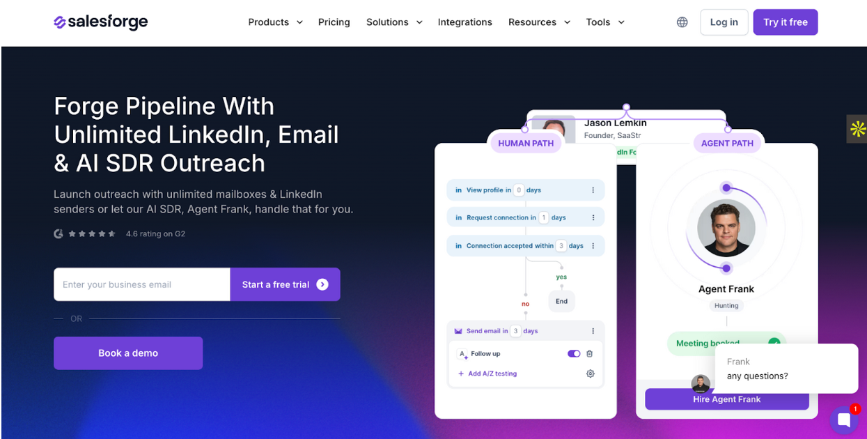 Did you know that automation can boost your sales team’s productivity by over 50%? (Source: McKinsey) Salesforge.ai is a powerful all-in-one sales prospecting and outreach tool that helps teams automate engagement, personalize communication, and maximize email deliverability, all while managing LinkedIn outreach alongside cold email campaigns.
