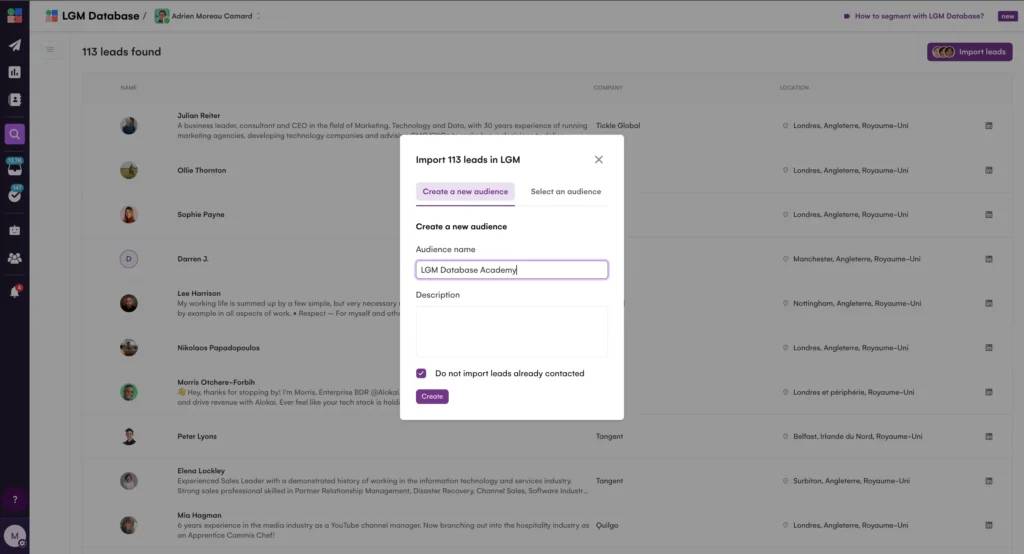 Seuls les leads qui n’ont pas encore été contactés via LGM seront importés dans cette audience.