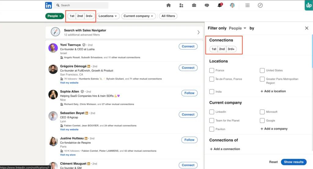 Dans la plupart des cas, cibler les relations de deuxième degré est une excellente façon de trouver des leads potentiels, car tu peux utiliser un contact en commun comme icebreaker.