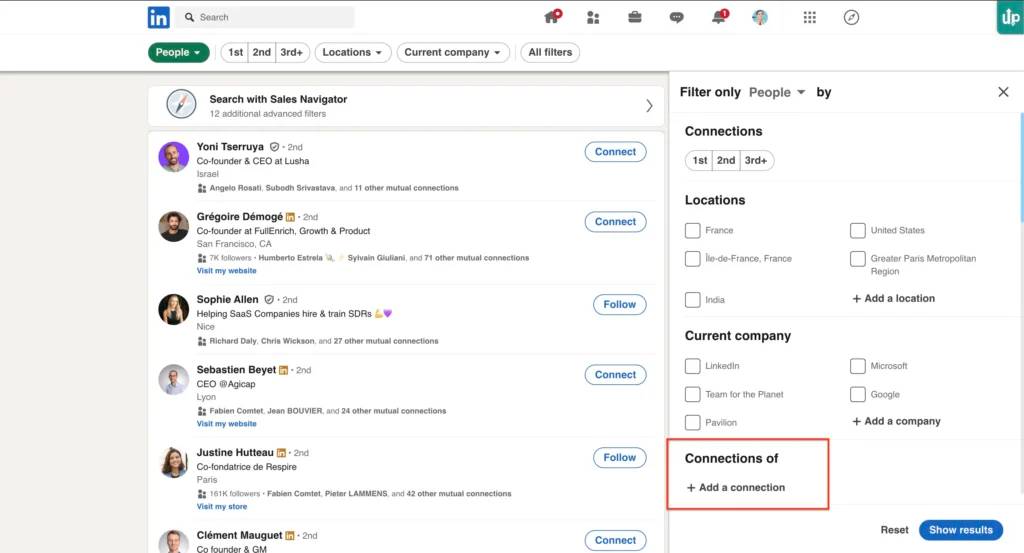 D’abord, plutôt que de chercher des nouvelles personnes au hasard, tu peux rechercher les relations de deuxième degré d’une personne précise. C’est idéal pour personnaliser ton copy d’outreach, car tu peux mentionner le contact en commun dans ton message.