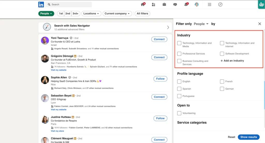 Tu peux aussi filtrer par industrie, ce qui est particulièrement utile lorsque tu cibles des professionnels d’un secteur précis.