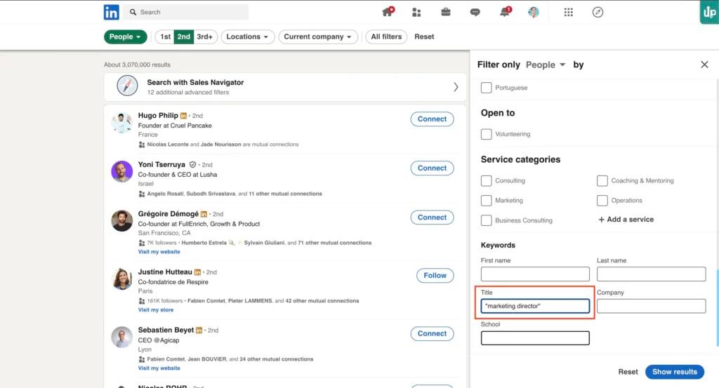 Ensuite, si tu tapes simplement Marketing Director dans la barre de recherche LinkedIn, tu risques d’obtenir des variantes comme Marketing Assistant Director ou Director of Marketing and Sales.