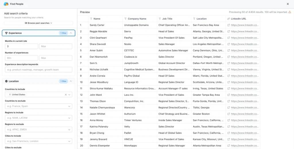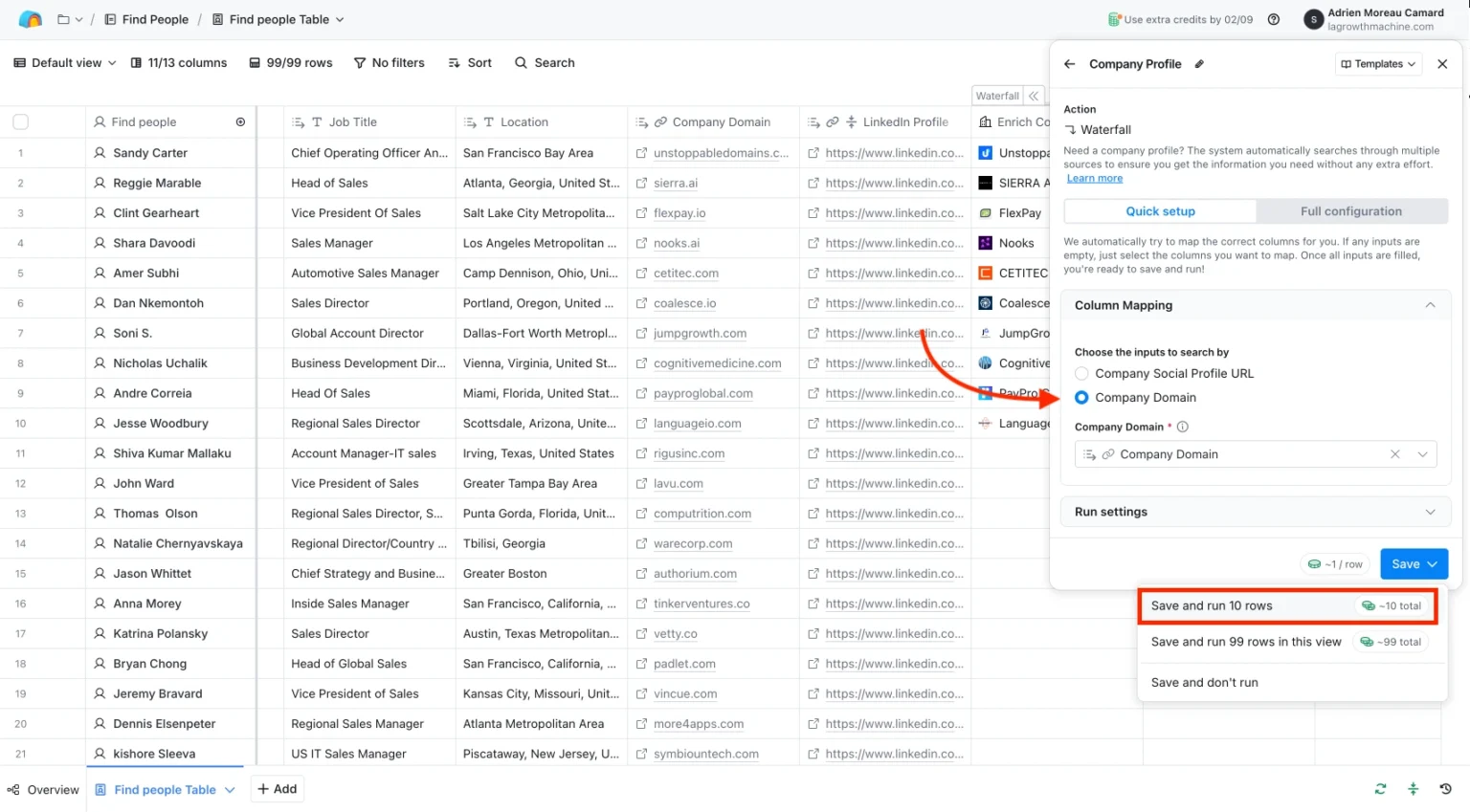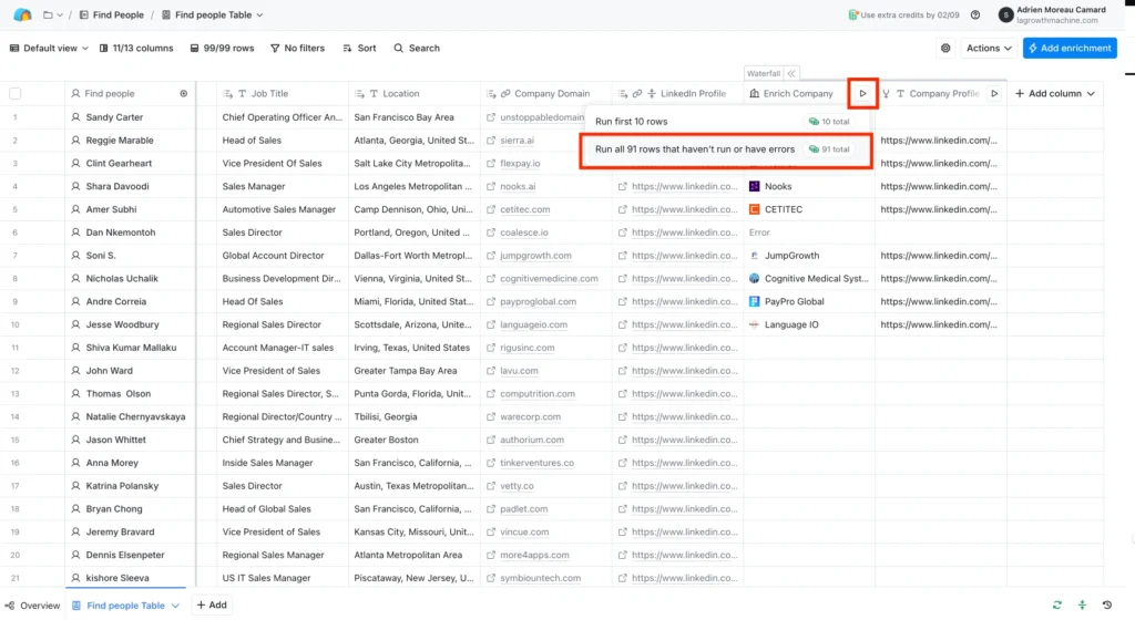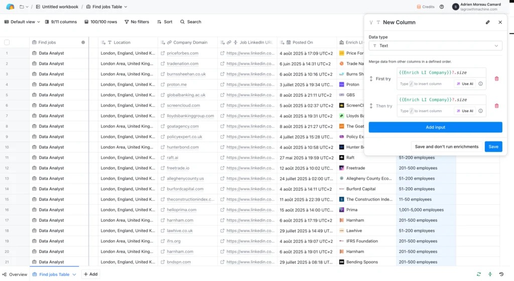 Ensuite, tu peux enrichir à partir du domaine de l’entreprise et trouver leur profil LinkedIn.