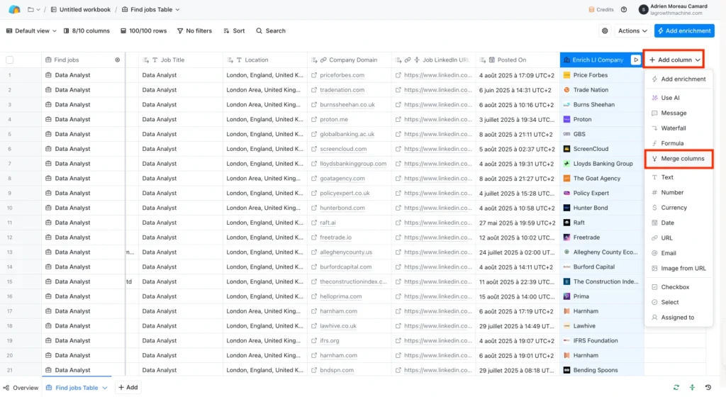 Pour ça, tu peux ajouter une colonne, puis cliquer sur “Merge columns” afin d’extraire les informations des entreprises que tu as enrichies.