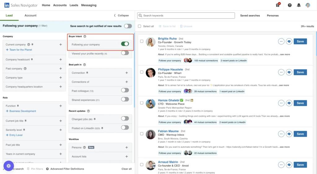Avec la recherche de leads dans Sales Navigator, tu peux construire une liste de leads qui suivent la page LinkedIn d’un concurrent.