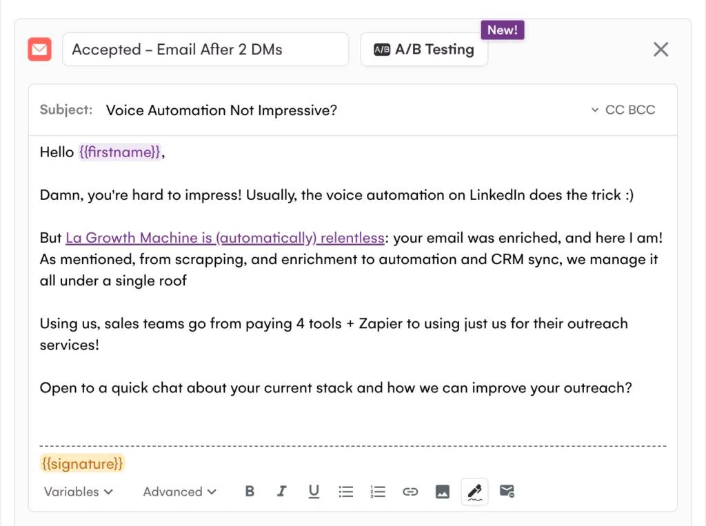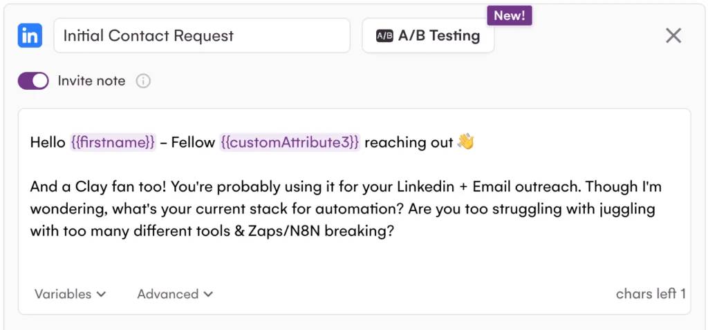 « Salut {{firstname}}, juste un petit mot rapide. J’ai pensé que ça pourrait t’intéresser, ce message est lui aussi automatisé. On aide des équipes comme la tienne à remplacer 3 ou 4 tools par un seul workflow. Curieux de savoir si c’est quelque chose que tu envisages! »