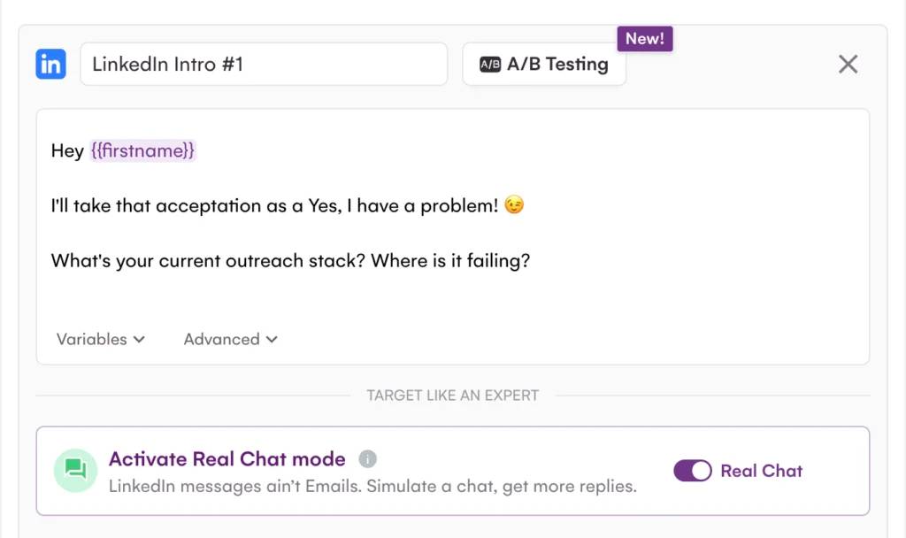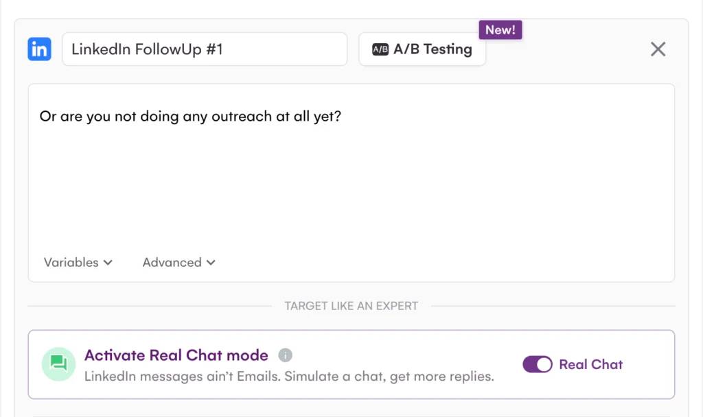 Le Real Chat Mode te permet d’envoyer tes messages LinkedIn sous forme de plusieurs petits messages courts, comme dans une conversation naturelle. Chaque phrase est envoyée séparément avec 1 seconde de délai entre chaque envoi.