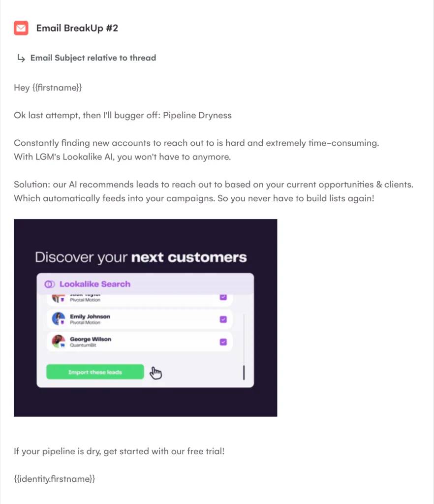 LGM est présenté comme le pipeline filler ultime, qui supprime la galère du list-building et garantit un flow continu de leads. La ligne “bugger off” adoucit la conclusion, garde un ton casual et non menaçant, tout en restant confiant.