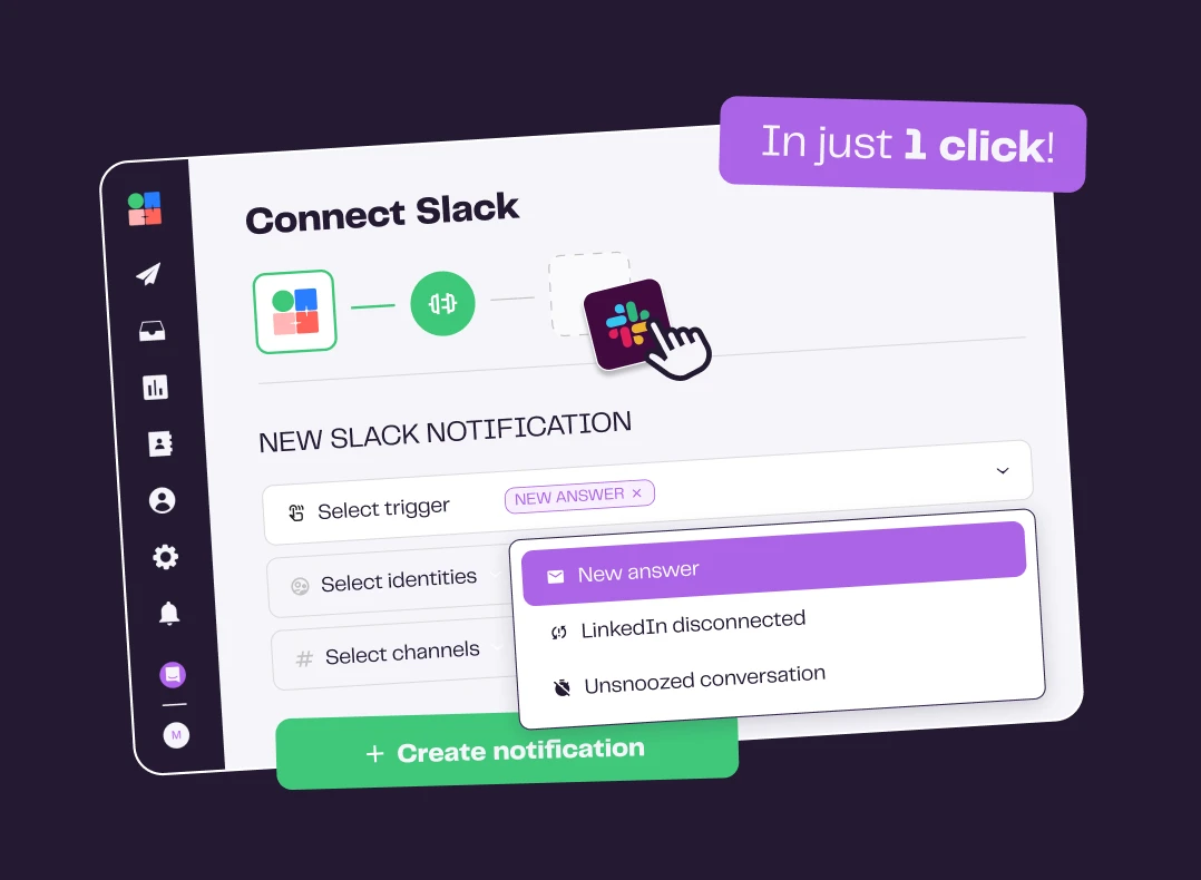 In outbound, timing is key. Replying within an hour can multiply x7 your chances of qualifying a lead. But you don’t live in your inbox. With our native Slack integration, La Growth Machine brings every important call to action into the channels your team already uses. You don’t miss any opportunity. We notify you where you work. On Slack.