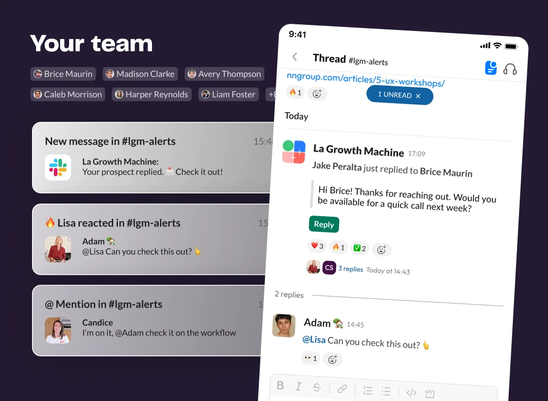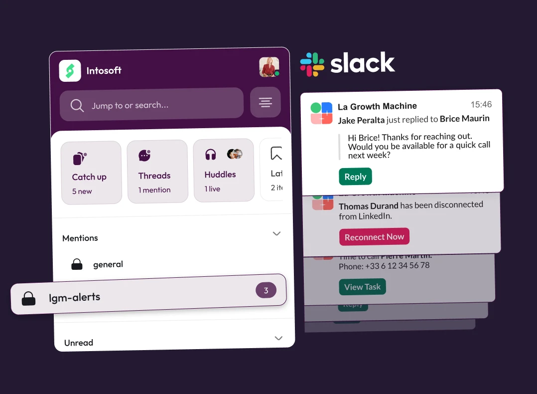When a prospect replies, you should not have to go hunting inside email inboxes, or Linkedin DMs. With Slack connected to La Growth Machine, you and your team know in real time: When a lead reply, if your email account gets disconnected, when there is a manual task to handle, if a conversation is unsnoozed